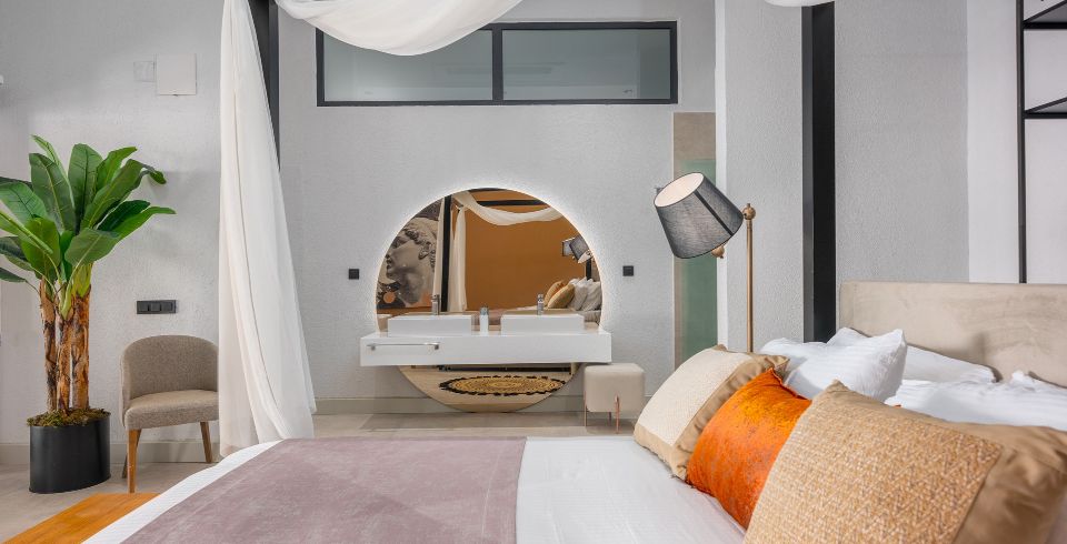4. Yatak Odası : Oda içerisinde 1 adet çift kişilik yatak, komodin, makyaj masası, TV ve özel banyo/WC bulunmaktadır.