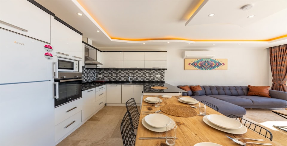 Mutfak : Modern Amerikan mutfak içerisinde buzdolabı, bulaşık makinası, fırın, ocak, mikrodalga fırın, tost makinası, yemek masası, yemek takımları, çatal ve bıçak takımları, tencere ve tava takımları, bardaklar bulunmaktadır.