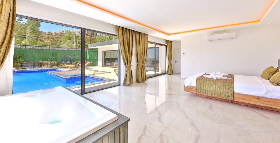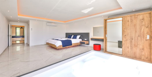 1. Yatak Odası : Çift kişilik yatak odamızda konforun tadını çıkarabileceğiniz, denize nazır, tüm yorgunluğunu giderebileceğiniz jakuzi bulunmaktadır. Klima, elbise dolabı, makyaj masası, tuvalet ve banyo bulunmaktadır.