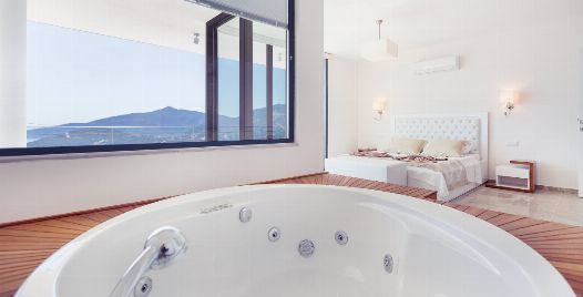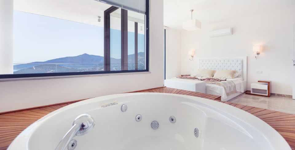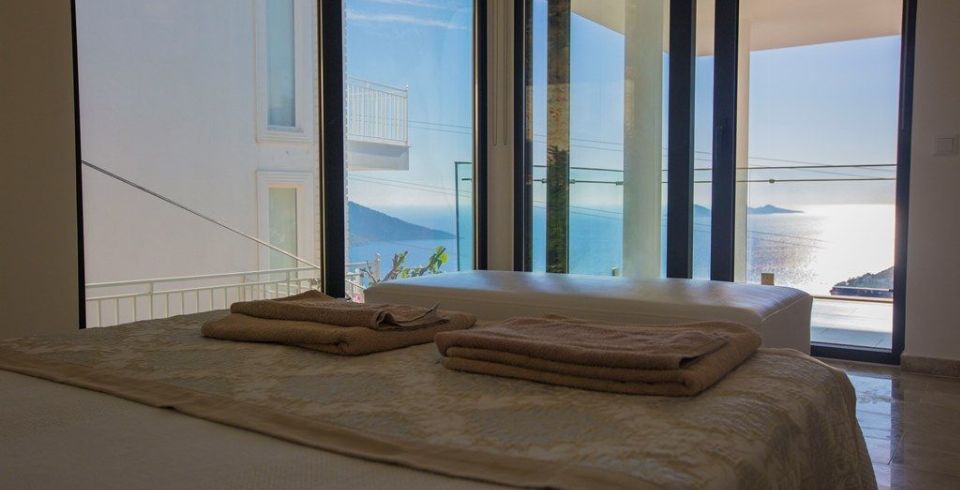 2. Yatak Odası : Çift kişilik süit yatak odası, klima, makyaj masası, elbise dolabı, jakuzi, komodin, banyo ve lavabo bulunmaktadır. Deniz manzaralı balkon
