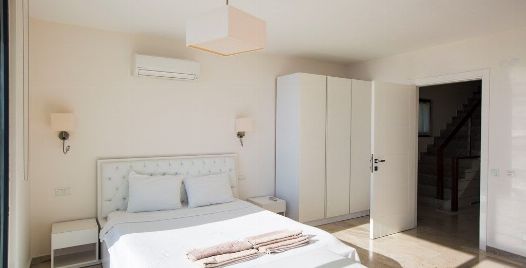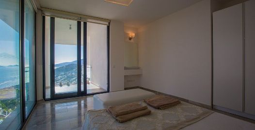 3. Yatak Odası : Çift kişilik süit yatak odası, klima, makyaj masası, elbise dolabı, komodin, banyo ve lavabo bulunmaktadır. Deniz manzaralı balkon.