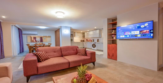Salon: Özenle döşenmiş salon, modern koltuklar, 8 kişilik yemek masası, LCD TV ve klima bulunmaktadır.