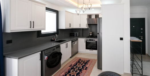 Mutfak: Buzdolabı, Bulaşık makinesi, Çamaşır makinesi, Mikrodalga, Fırın, 4’lü Ocak, Elektrikli su ısıtıcı, 6 kişilik yemek takımı, Tava, Tencereler, Çatal bıçak vb. bulunmaktadır.