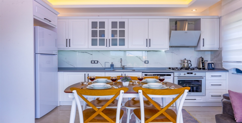 Mutfak : Villamızın içinde modern Amerikan mutfak bulunmaktadır. Mutfakta bulaşık makinası, ankastre fırın, buzdolabı, çamaşır makinası, ankastre 4’lü ocak, elektrikli su ısıtıcı kettle, tencere ve tava takımı, yemek takımı, kaşık ve çatal seti ve bardaklar bulunmaktadır. Havuz başına geçiş bulunmaktadır.