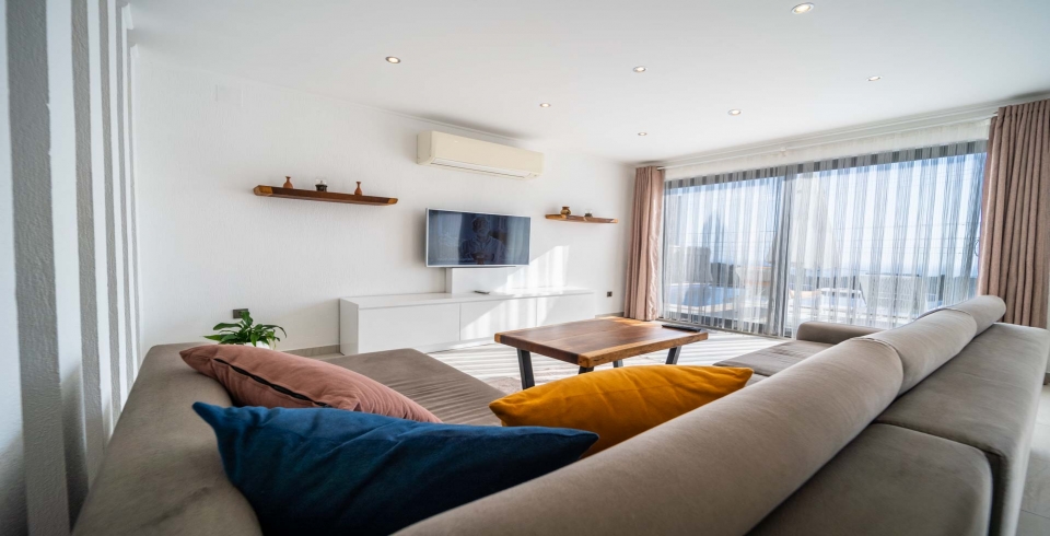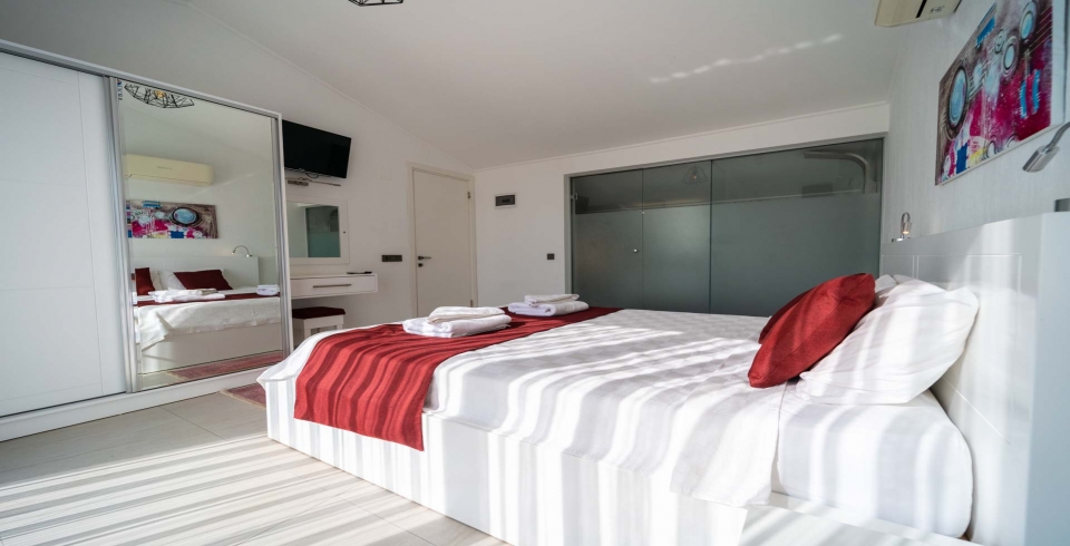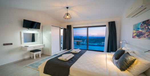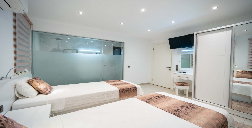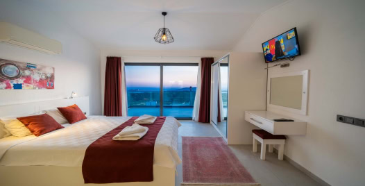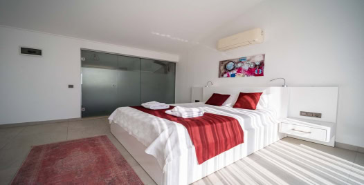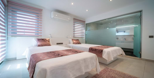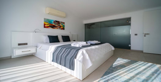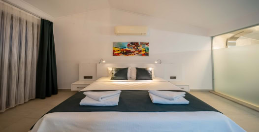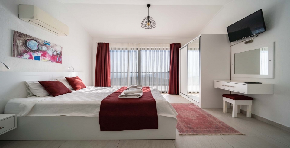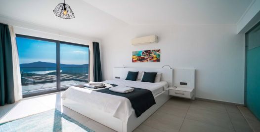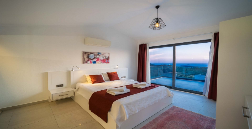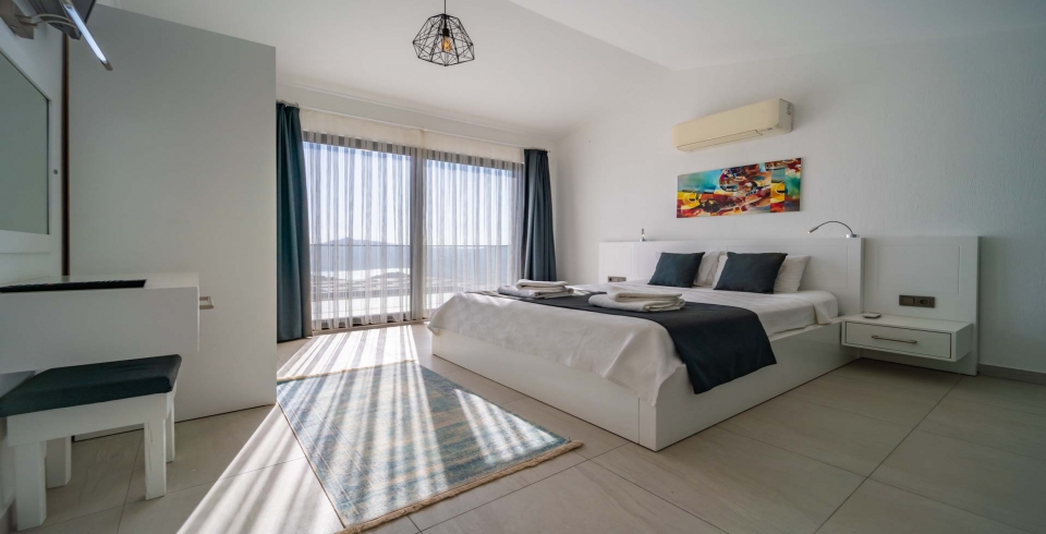 Üç yatak odasının tamamı klimalı olup, ebeveyn banyosuna sahiptir. Ana yatak odasında çift kişilik yatak ve deniz manzaralı balkon; diğer odalarda ise ikiz yatak seçenekleri mevcuttur. Odalar sade, modern ve ferah dekorasyonuyla huzurlu bir konaklama atmosferi sunar.