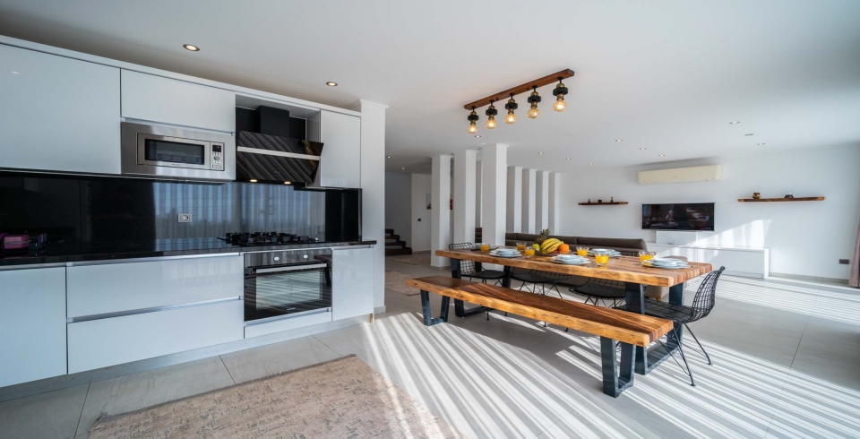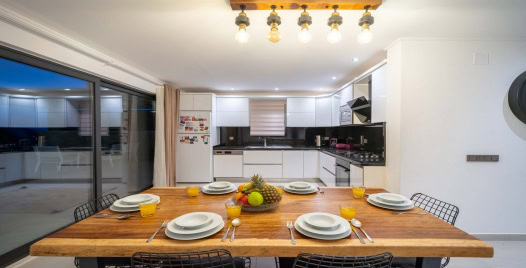 Mutfak: Villamızın geniş Amerikan mutfağı ile sizlere kendi evinizin mutfağı gibi hissettirecek. Ayrıca mutfakta klima, bulaşık makinası, buzdolabı, çamaşır makinası, mikrodalga fırın, su ısıtıcısı, fırın, 4`lü ocak seti ve 6 kişilik geniş yemek masası ile tava tencere vb. mutfak araç gereçlerini kullanma fırsatını sizlere sunuyoruz.