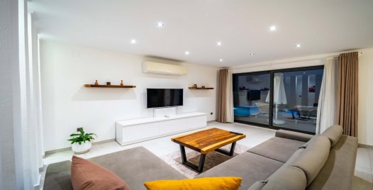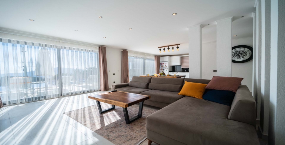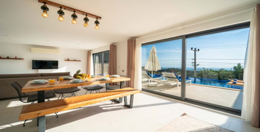 İç mekânında modern detaylar ön plandadır. Ferah salonunda konforlu oturma grubu, televizyon, klima ve havuz terasına doğrudan çıkış bulunur. Amerikan mutfak kısmında buzdolabı, ankastre fırın, mikrodalga, bulaşık makinesi, çamaşır makinesi, kettle, ocak, yemek takımı ve tüm mutfak gereçleri yer alır. Villanın her alanı, misafirlerine ev konforunda bir tatil sunacak şekilde özenle hazırlanmıştır.