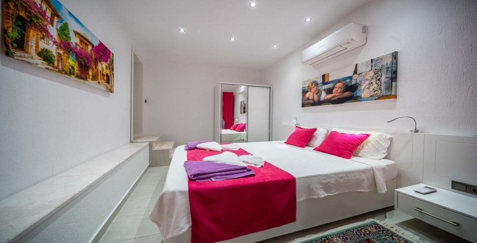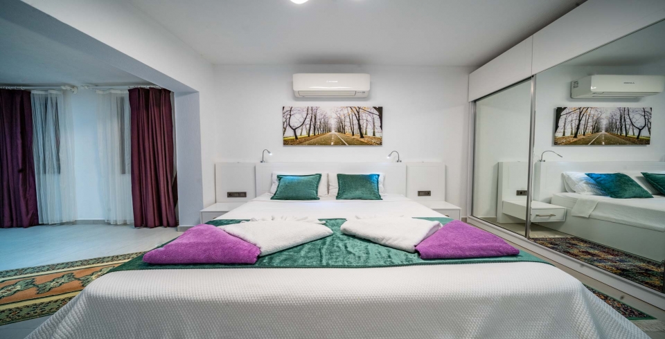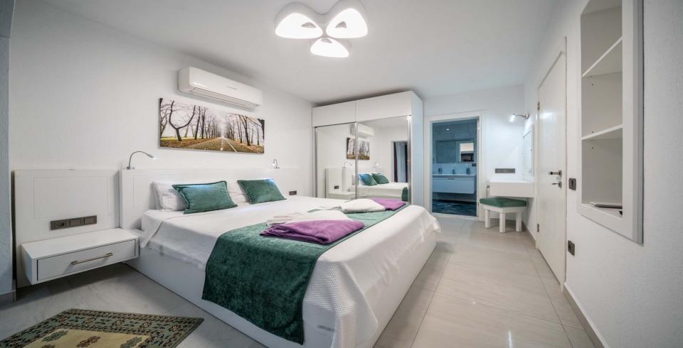 2. Yatak Odası : Bir adet çift kişilik yatak, komodin, elbise dolabı, makyaj masası, jakuzi, klima, banyo ve tuvalet bulunmaktadır.