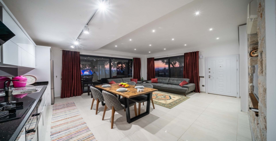 Villanın iç mekânı ferah, modern ve konforlu detaylarla donatılmıştır. Geniş oturma alanında televizyon, klima ve rahat bir oturma grubu bulunurken, tam donanımlı Amerikan mutfakta buzdolabı, ankastre fırın, mikrodalga, çamaşır ve bulaşık makinesi gibi ihtiyaç duyabileceğiniz tüm ekipmanlar yer almaktadır. Aydınlık salon kısmı havuz terasına açılarak doğa manzarasının keyfini içeri taşır.