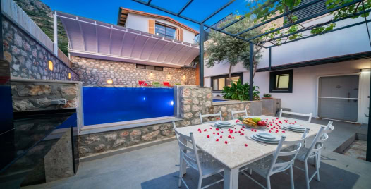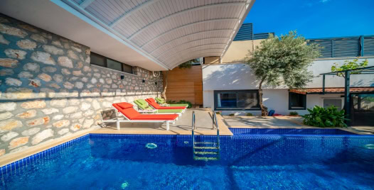 Villanın dış alanı tamamen korunaklı özel yüzme havuzu ile çevrilidir. Havuzun ön cephesinde yer alan cam detay, villa mimarisine modern bir dokunuş kazandırır. Gözlerden uzak havuz terasında şezlonglar, oturma grubu ve barbekü alanı bulunur; böylece gün boyu doğanın keyfini çıkarabilir, akşamları ise yıldızlar eşliğinde huzurlu saatler geçirebilirsiniz.