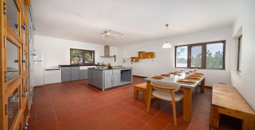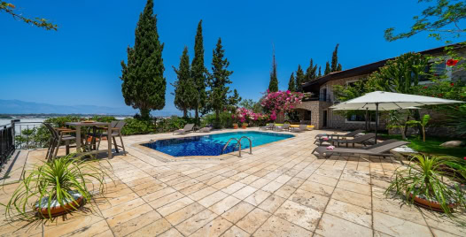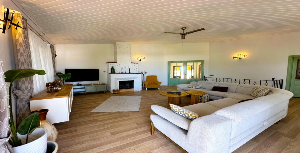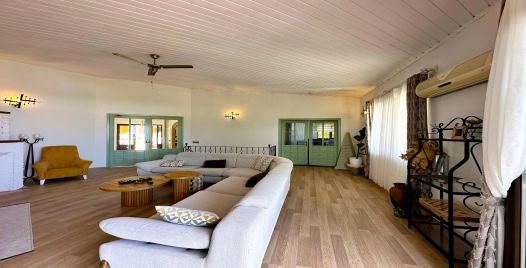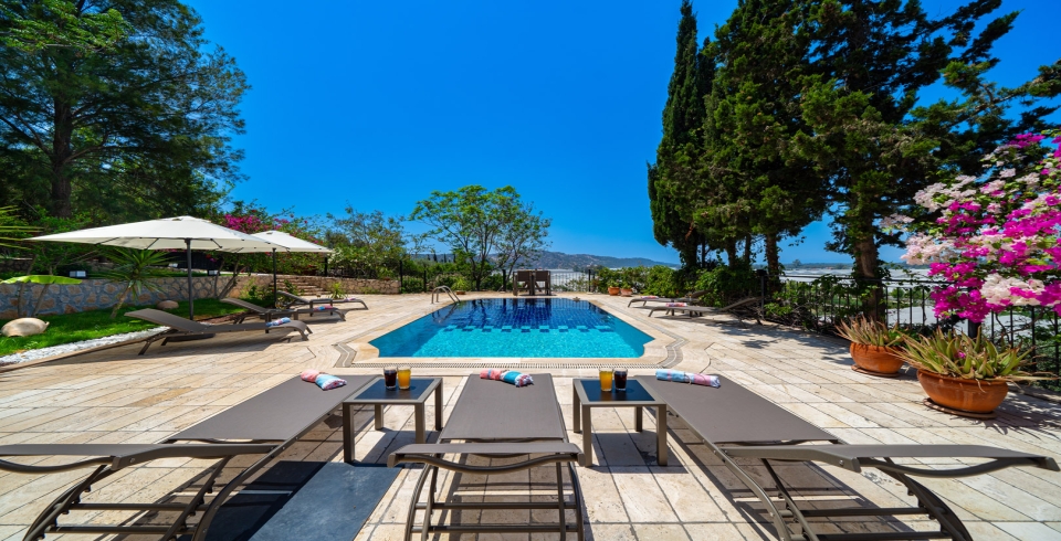 Salon : Açık ve soft renklerle dizayn edilmiş deniz ve doğa manzaralı salonda oturma grubu, uydu TV (LCD), kablosuz internet, klima,10 kişilik yemek masası ve ekstra W/C bulunmaktadır. Salondan havuz terasına çıkılabilmektedir.