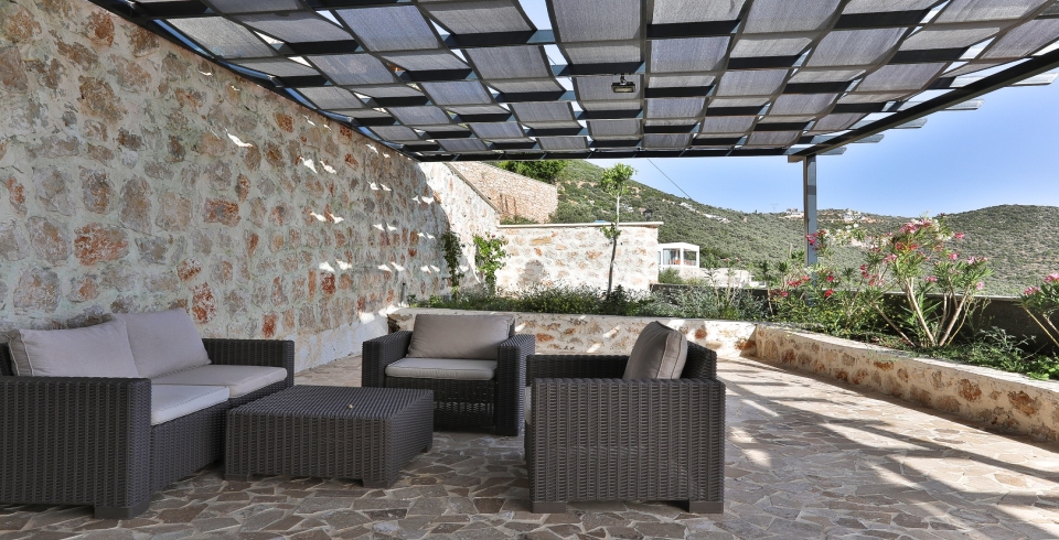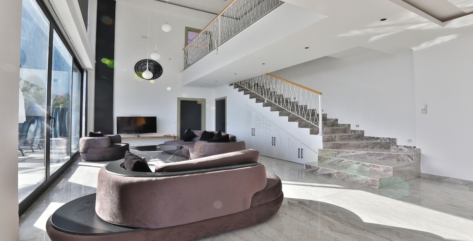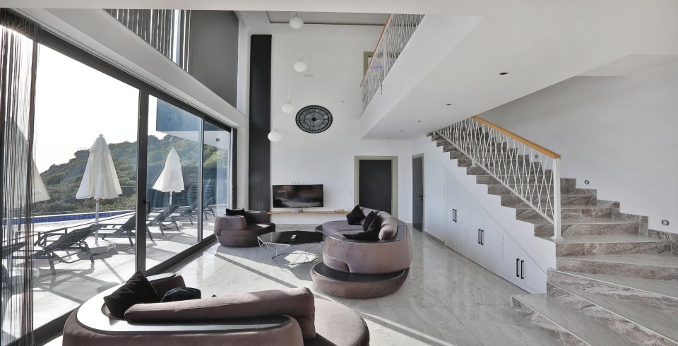 Salon : Salon içerisinde oturma grubu, TV, klima, sehpa bulunmaktadır. Havuz terasına çıkış yapılabilmektedir.