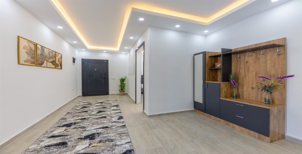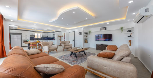 Salon: Oturma grubu, orta sehpa, TV, klima, havuz terasına çıkış bulunmaktadır.