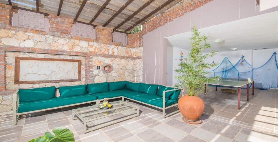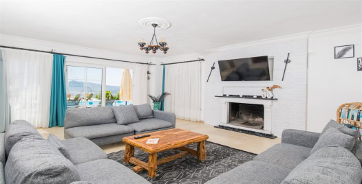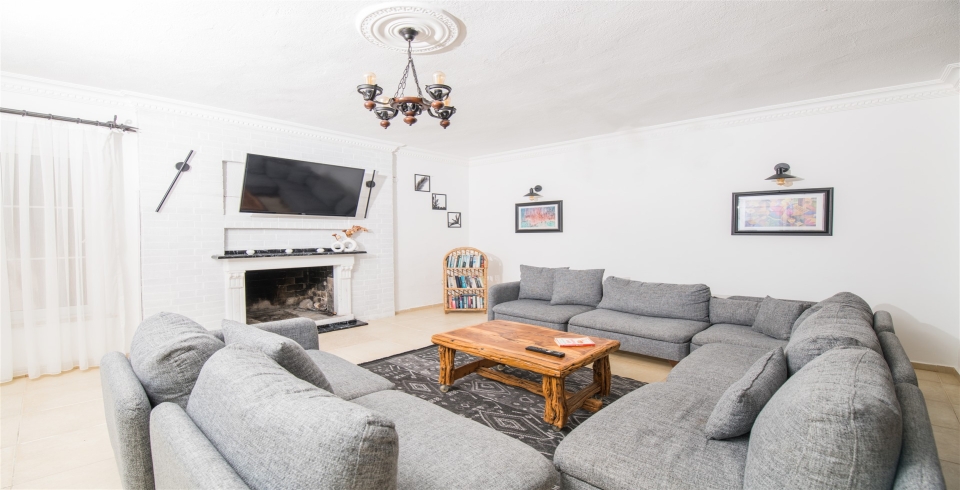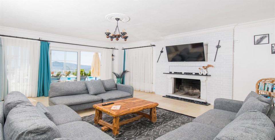 Salon: Modern eşyalar ile dekore edilmiş salonda rahat L koltuk, TV, TV ünitesi, Dvd oynatıcı, uydu alıcısı, klima ve internet yer almaktadır. Salondan havuz terasına geçiş vardır.