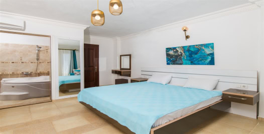 3. Yatak Odası: Çift kişilik bir adet yatak, elbise dolabı, komodin, makyaj masası, klima, banyo ve tuvalet bulunmaktadır.