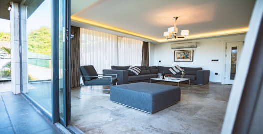Salon: 1 adet oturma grubu, yemek masası, LCD TV, uydu alıcısı, DVD player, salondan havuza çıkış ve ortak kullanım tuvalet bulunmaktadır.