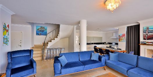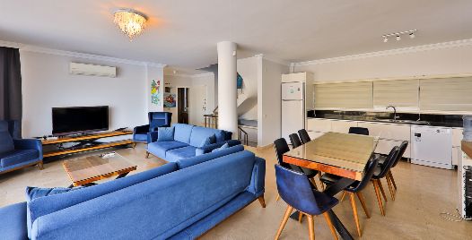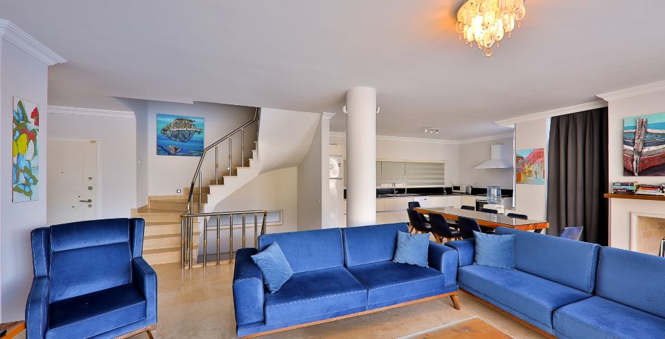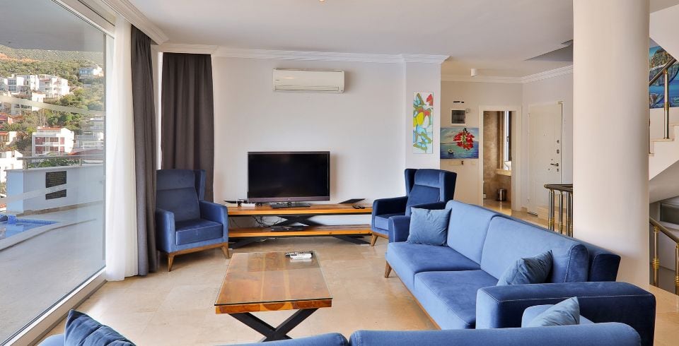Salon : Villamızın salonu deniz manzaralı olup modern ve zevkle döşenmiştir. Salonumuzda oturma grubu, TV, DVD, klima, şömine, WC ve lavabo bulunmaktadır.