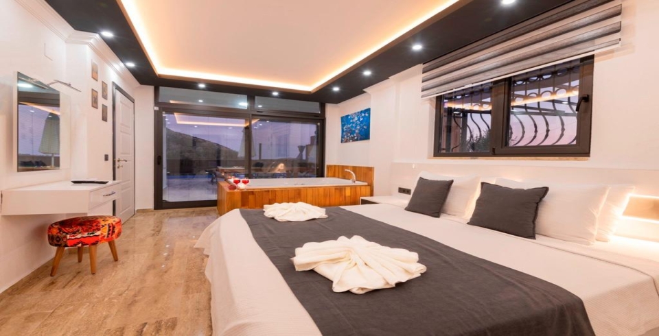 1.Yatak Odası: 1 adet çift kişilik yatak, elbise dolabı, komodin, klima, makyaj masası, jakuzi, banyo ve lavabo bulunmaktadır.