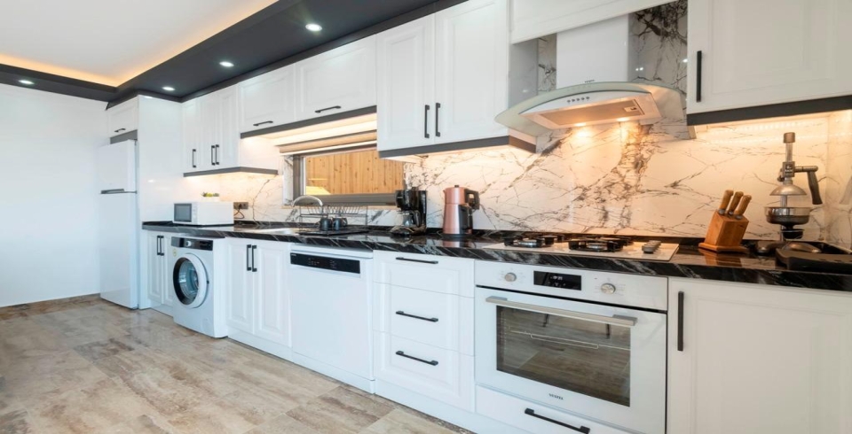 Mutfak: Açık planlı mutfak, 4 kişiye yetecek kadar mutfak malzemeleri, buzdolabı, fırın, ocak, mikrodalga fırın, bulaşık makinesi, çamaşır makinesi, tost makinesi, kettle ve çaydanlık bulunmaktadır..