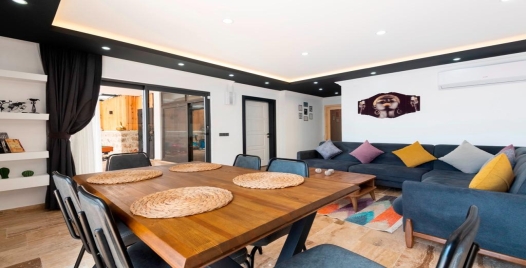 Salon: Özenle döşenmiş salon, modern koltuklar, 4 kişilik yemek masası, LCD TV ve klima bulunmaktadır.