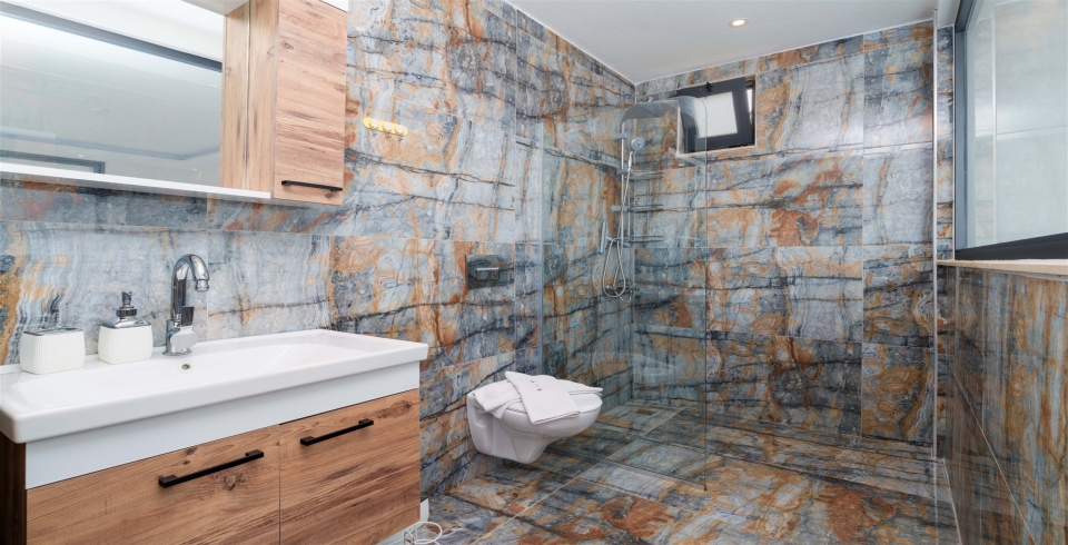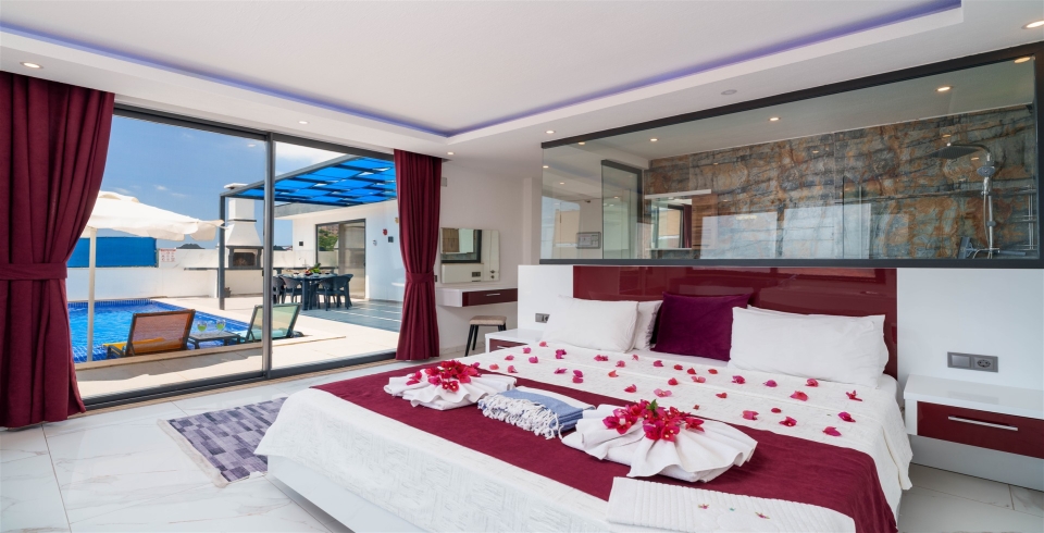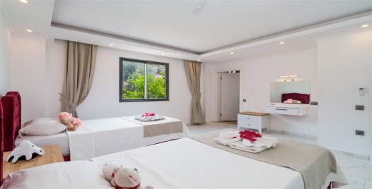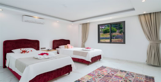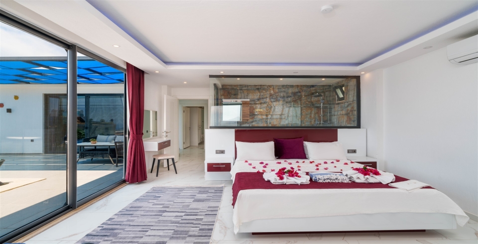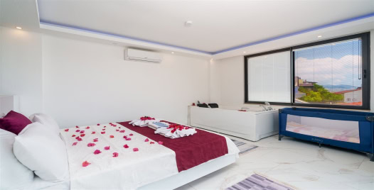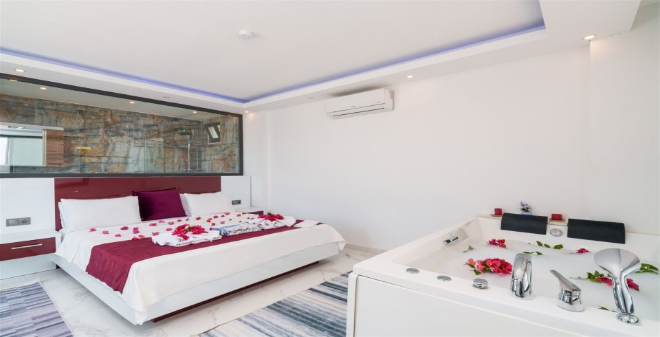 1. Yatak Odası: Çift kişilik yatak, klima, jakuzi, komodin, elbise dolabı, makyaj masası, banyo ve tuvalet bulunmaktadır.