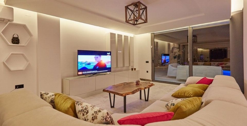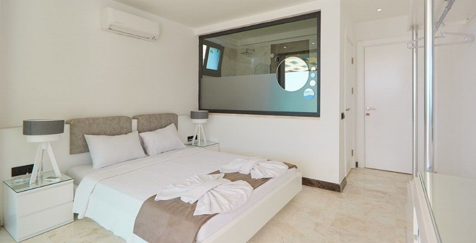 Villanın iç mekânı modern çizgilerle dekore edilmiş olup, geniş ve aydınlık salonunda deniz manzarasının keyfini çıkarabilirsiniz. Tam donanımlı açık mutfak; buzdolabı, bulaşık makinesi, mikrodalga, fırın, tost makinesi ve mutfak gereçleriyle misafirlerin tüm ihtiyaçlarını karşılar. Salon bölümünde rahat oturma grubu, TV ve yemek alanı yer alır.