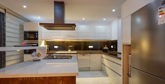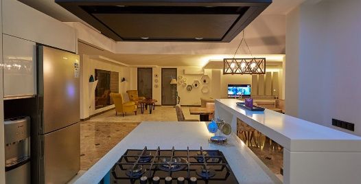 Mutfak : Modern dizayn edilmiş Amerikan mutfak ve dolapları, buzdolabı, çamaşır makinesi, bulaşık makinesi, su sebili, mikro dalga fırın, çaycı, 4'lü ankastre ocak, elektrikli su ısıtıcısı, elektrikli süpürge, 10 kişilik yemek takımı, tava ve tencere takımı bulunmaktadır.