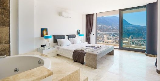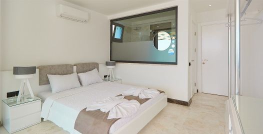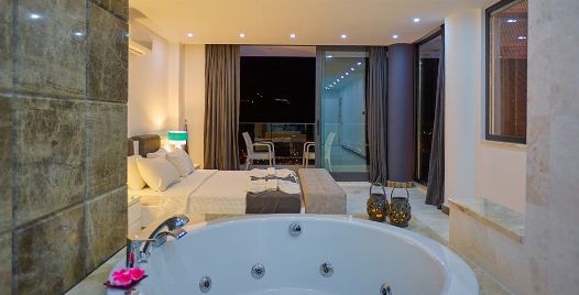 5. Yatak Odası : Süit oda çift kişilik yatak, komodin, klima, makyaj masası, elbise dolabı, banyo ve tuvalet bulunmaktadır. Ayrıca balkonunda özel jakuzi bulunmaktadır.