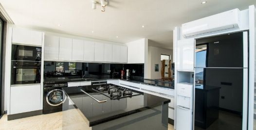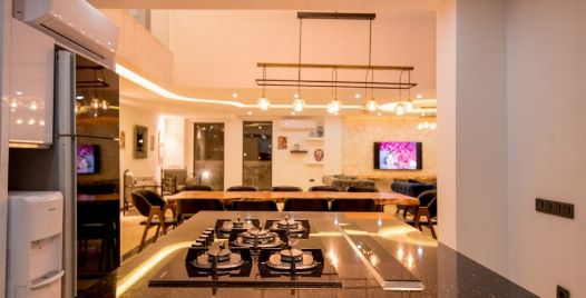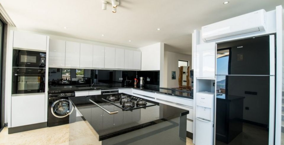 Mutfak: Modern dizayn edilmiş Amerikan mutfak ve dolapları, buzdolabı, çamaşır makinesi, bulaşık makinesi, su sebili, mikro dalga fırın, çaycı, 4'lü ankastre ocak, elektrikli su ısıtıcısı, elektrikli süpürge, 10 kişilik yemek takımı, tava ve tencere takımı bulunmaktadır.