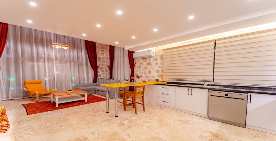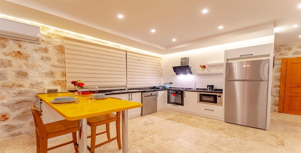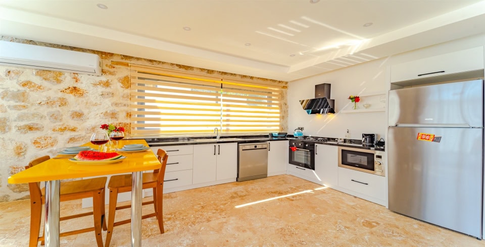 Mutfak : Modern Amerika mutfağımızda yemek masası, buzdolabı, çamaşır makinesi, mikrodalga fırın, 4’lü ocak, tost makinesi, çatal-bıçak takımı, tencere-tava takımı, bulaşık makinesi bulunmaktadır.