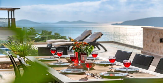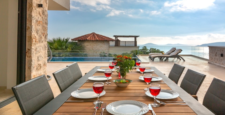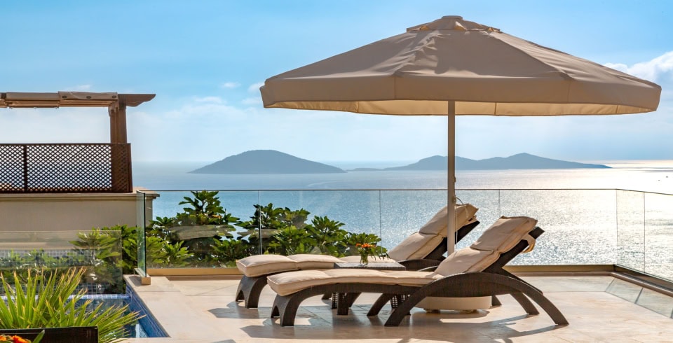Büyük bir dış teras, özel havuz, yemek ve oturma alanları, bir kömür barbekü ve şezlonglar bulunmaktadır. Tüm yatak odaları ve yaşam alanlarında klima bulunmaktadır. Çatı katında da özel çatı terasına erişimi olan bir çift kişilik yatak odası bulunmaktadır. Villa'da tüm misafirlerin kullanımına sunulan ikinci bir çatı terası ekstra bir bonus olarak sunulmaktadır. Tüm yatak odaları ve çatı terası, adaları ve koyu gören panoramik deniz manzaralarını sunmaktadır. Havuz güvertesi altındaki ikincil süit, bir oturma odası ve özel banyolu bir çift kişilik yatak odası bulunmaktadır.
