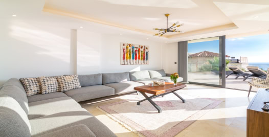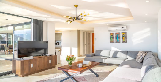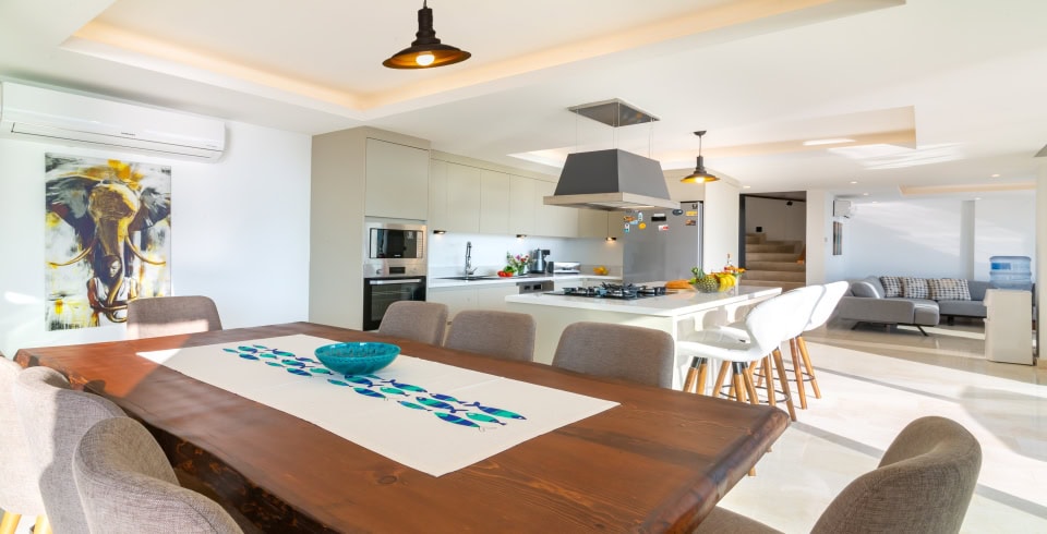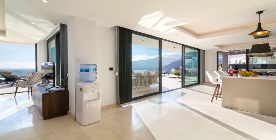 Salon: Geniş ve modern renklerle dekore edilmiş salonun eşsiz deniz ve doğa manzarası bulunmaktadır. Salon içerisinde oturma grubu, uydu TV (LCD), kablosuz internet, klima,8 kişilik yemek masası, havuz terasına çıkış ve ekstra wc bulunmaktadır.