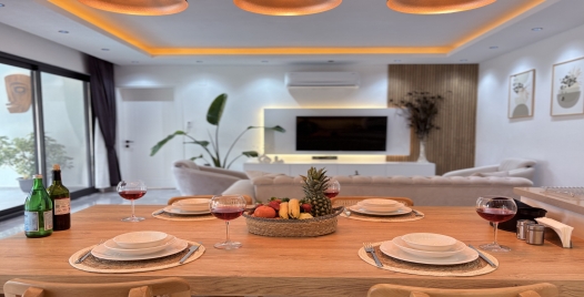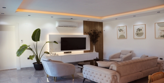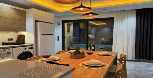 Salon: Özenle döşenmiş salon, modern koltuklar, 4 kişilik yemek masası, LCD TV ve klima bulunmaktadır.