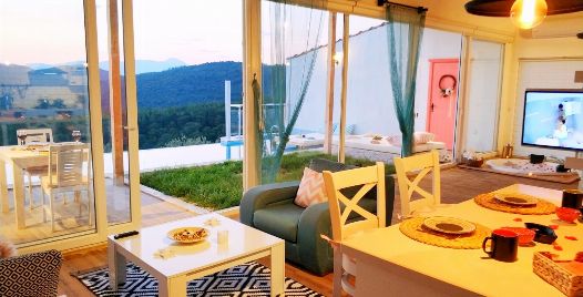 Salon : Villa salonunda konforlu oturma grubu, klima, TV, internet, uydu alıcı, yemek masası, sehpa bulunmaktadır.