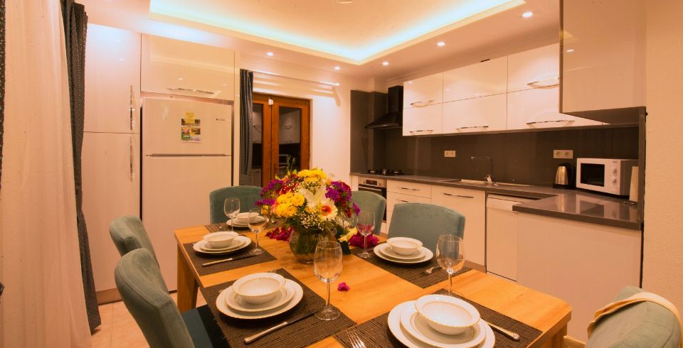 Mutfak : Modern Amerikan mutfak içerisinde buzdolabı, bulaşık makinası, fırın, ocak, mikrodalga fırın, yemek masası, yemek takımları, çatal ve bıçak takımları, tencere ve tava takımları, bardaklar bulunmaktadır.