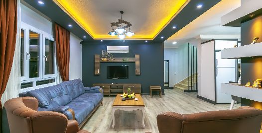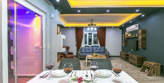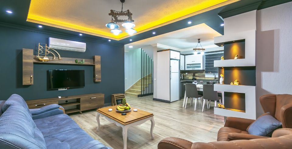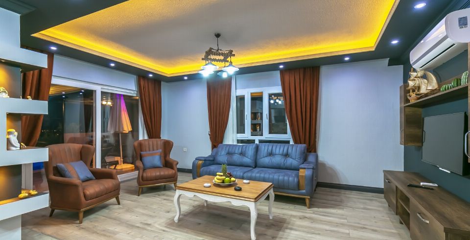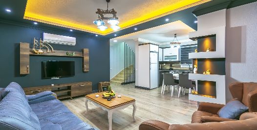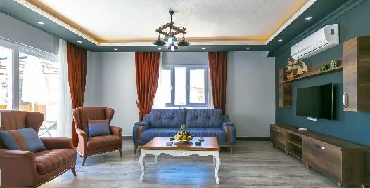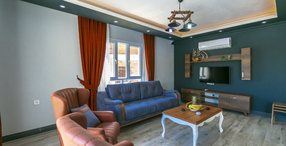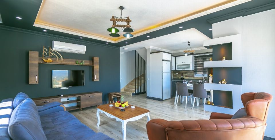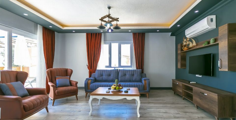 Salon: Villa salonunda konforlu oturma grubu, klima, TV, internet, uydu alıcı, yemek masası, sehpa bulunmaktadır.