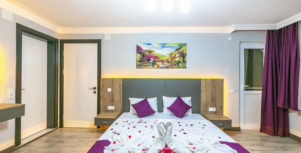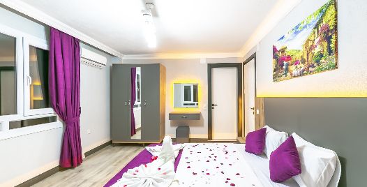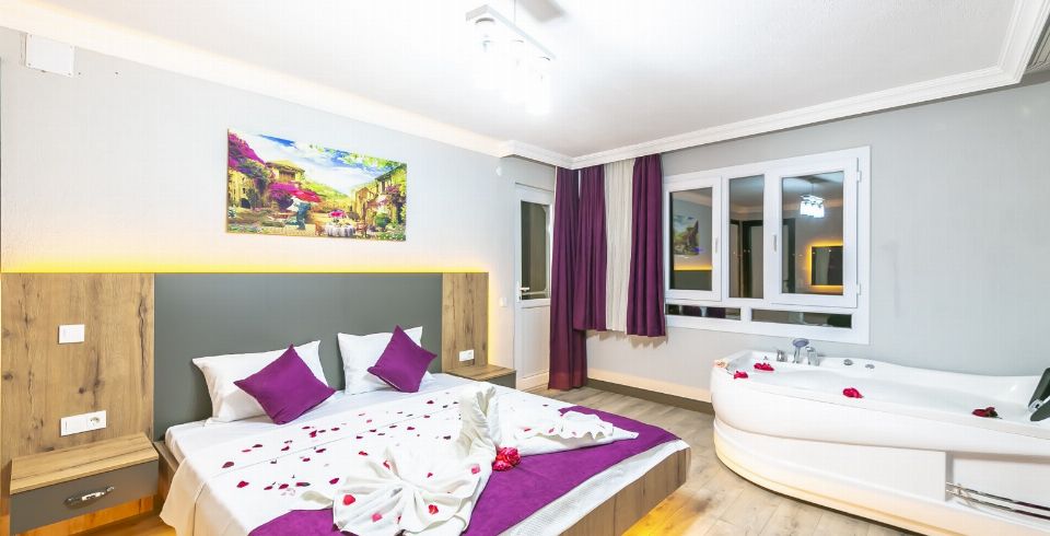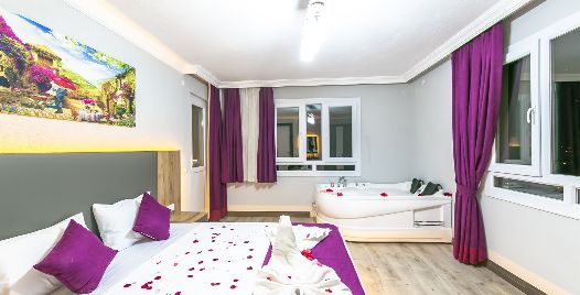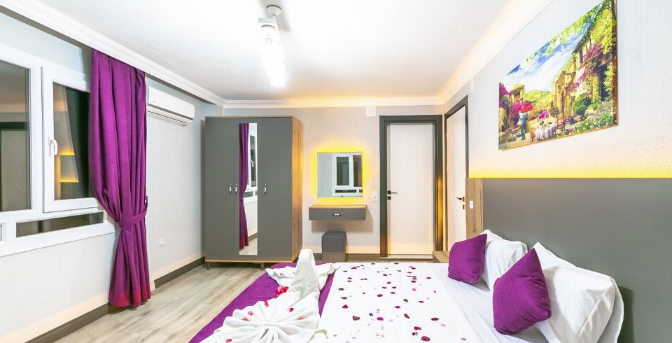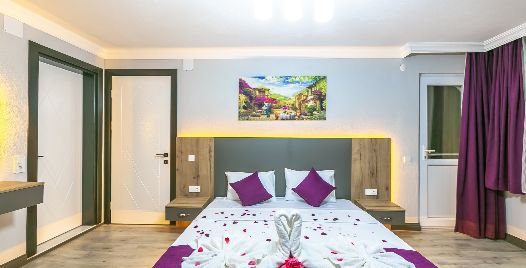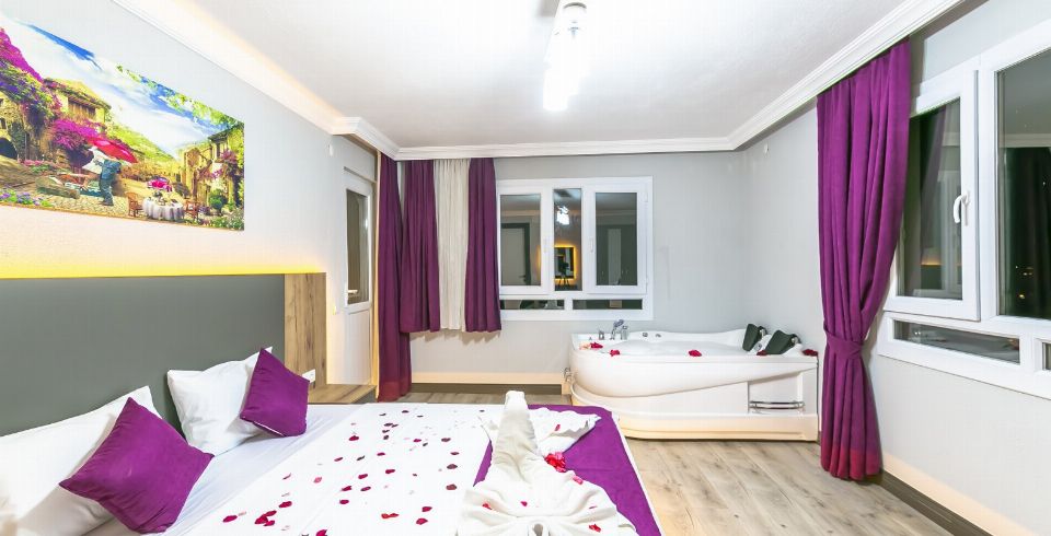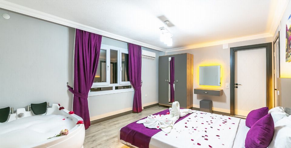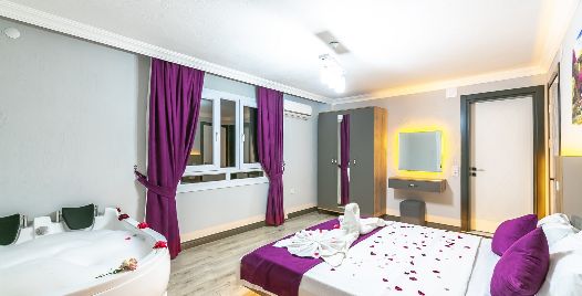 1. Yatak Odası: Çift kişilik yatak, klima, jakuzi, komodin, elbise dolabı, makyaj masası, banyo ve tuvalet bulunmaktadır.