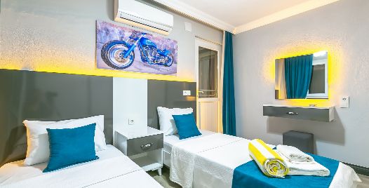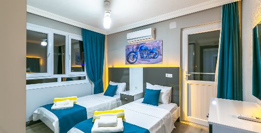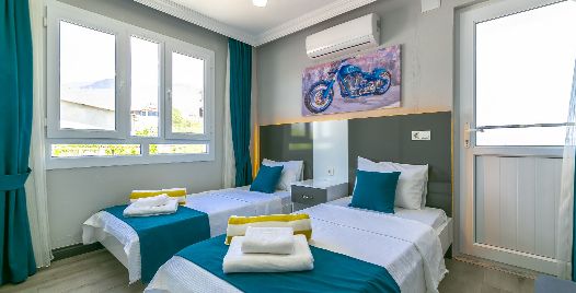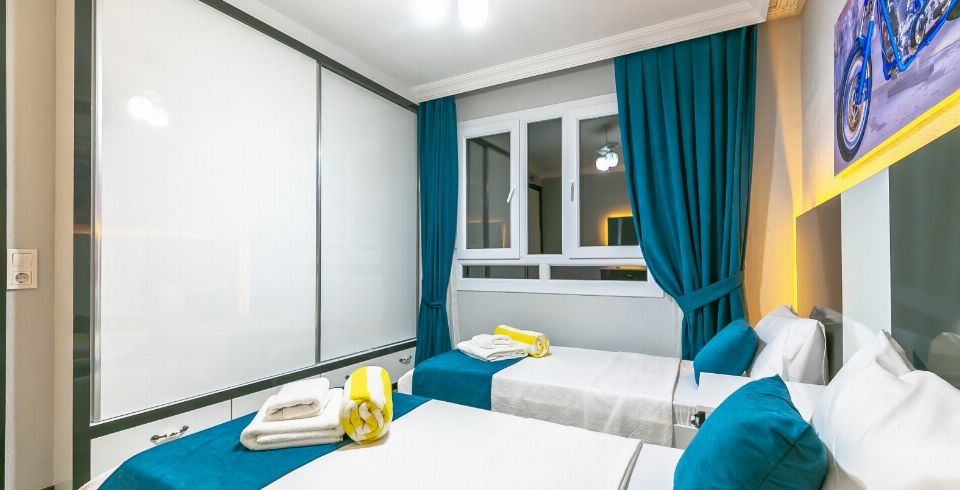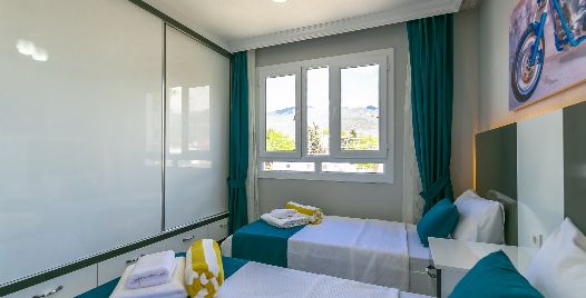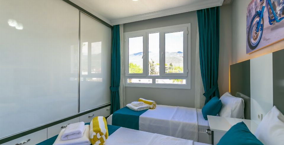 2. Yatak Odası: 2 adet tek kişilik yatak, klima, komodin, elbise dolabı, makyaj masası, banyo ve tuvalet bulunmaktadır.