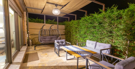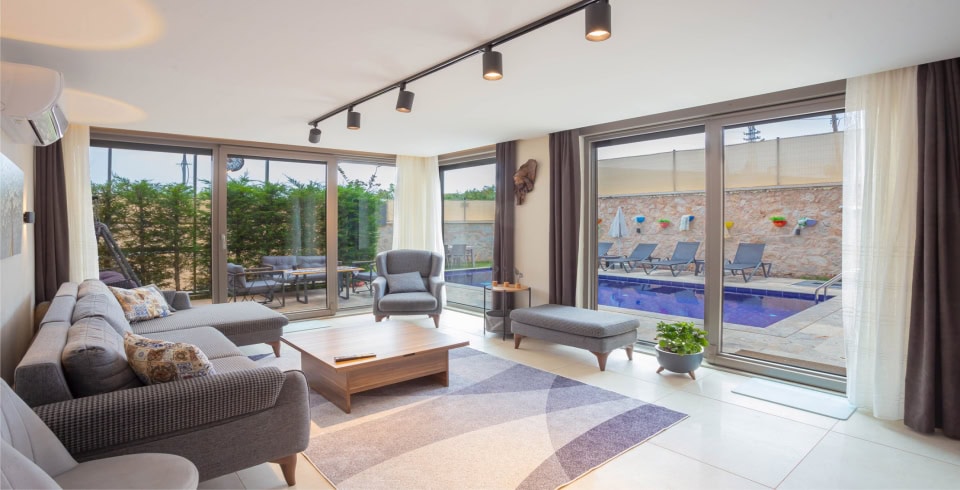 Salon : Salonda masa ve sandalyeler, LCD TV, uydu alıcı, oturma grubu, ütü ve ütü masası, lavabo, kablosuz modem, lavabo ve tuvalet bulunmaktadır. Salondan havuz kenarına çıkış vardır.