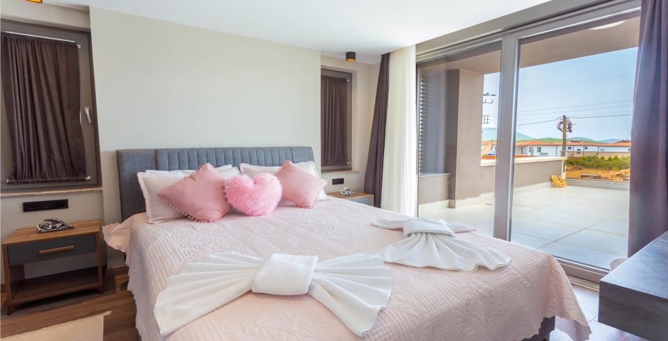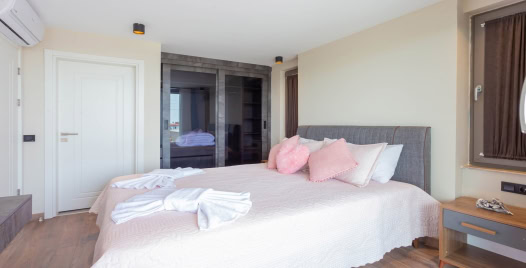 1. Yatak Odası : Klimalı süit yatak odasıdır. Yatak odasında 1 adet çift kişilik yatak, makyaj masası, elbise dolabı, banyo, tuvalet balkon bulunmaktadır.