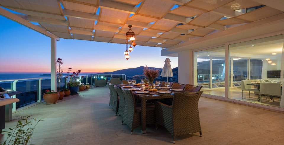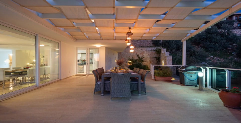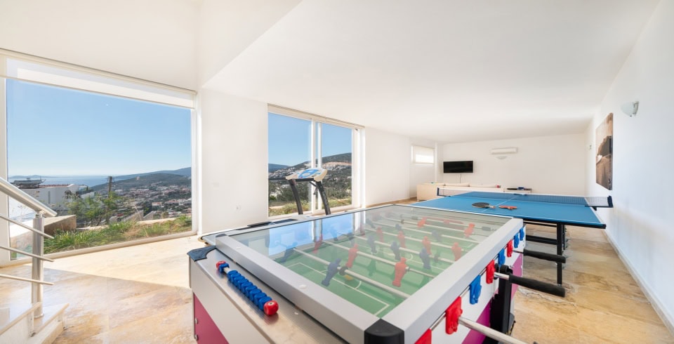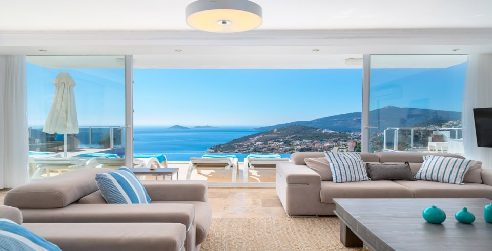 Salon : Villamızın deniz manzaralı Salonda masa ve sandalyeler, LCD TV, uydu alıcı, DVD player, oturma grubu, ütü ve ütü masası, lavabo, kablosuz modem, elektrik süpürgesi, lavabo ve tuvalet bulunmaktadır. Salondan havuz kenarına çıkış vardır.