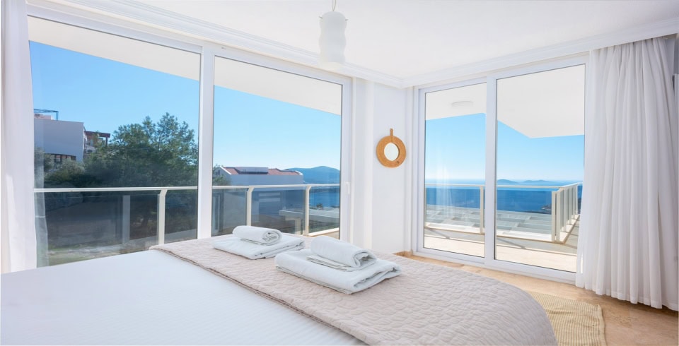 1. Yatak Odası : Klimalı süit yatak odasıdır. Yatak odasında 1 adet çift kişilik yatak, makyaj masası, elbise dolabı, banyo, tuvalet balkon bulunmaktadır. Deniz manzaralı balkonda oturma grubu yer almaktadır.