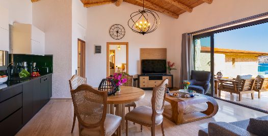 Salon : Salon içerisinde oturma grubu, TV, klima, sehpa bulunmaktadır. Havuz terasına çıkış yapılabilmektedir.