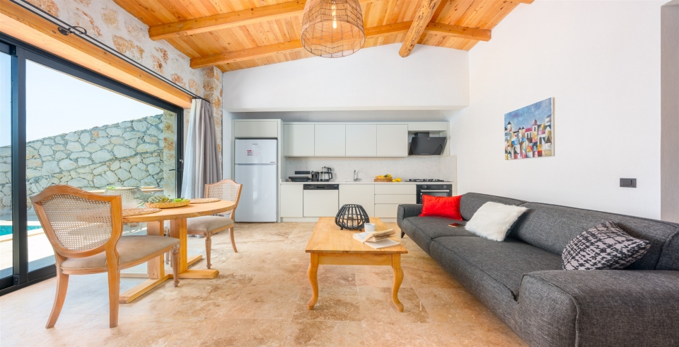 Salon : Salon içerisinde oturma grubu, TV, klima, sehpa bulunmaktadır. Havuz terasına çıkış yapılabilmektedir.