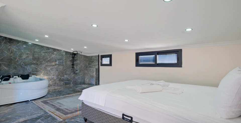1.Yatak Odası: Çift kişilik yatak, jakuzi, komodin, elbise dolabı, makyaj masası, klima, banyo ve tuvalet bulunmaktadır.