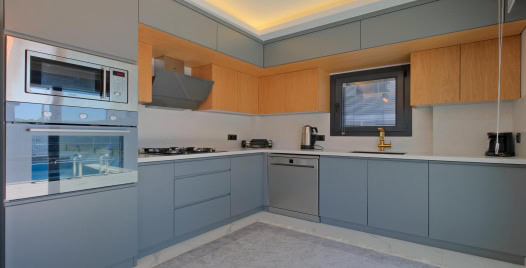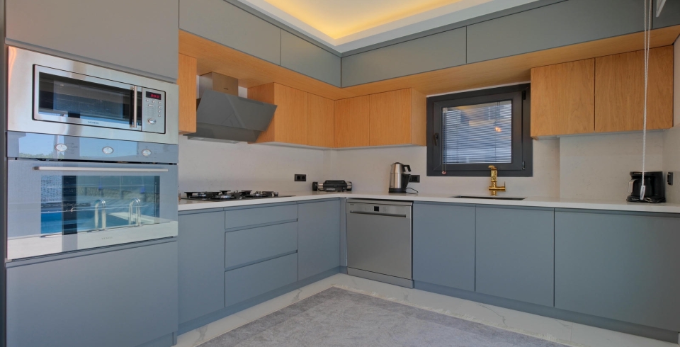 Mutfak: Amerikan mutfak, bulaşık makinası, buzdolabı, ankastre fırın, mikrodalga fırın, ankastre 4'lü ocak, su ısıtıcısı, tencere ve tava takımı, yemek takımı, kaşık çatal bıçak takımı, bardak takımı, yemek masası, sandalyeler.
