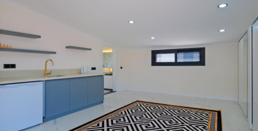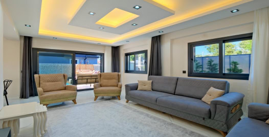 Salon: Oturma grubu, klima, orta sehpa, TV ünitesi ve TV, bulunmaktadır. Havuz terasına çıkış bulunmaktadır.