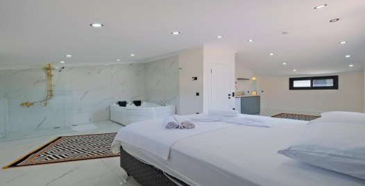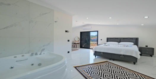1.Yatak Odası: Çift kişilik yatak, jakuzi, komodin, elbise dolabı, makyaj masası, klima, banyo ve tuvalet bulunmaktadır.