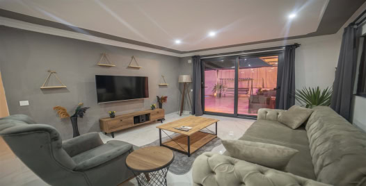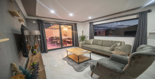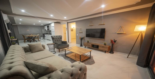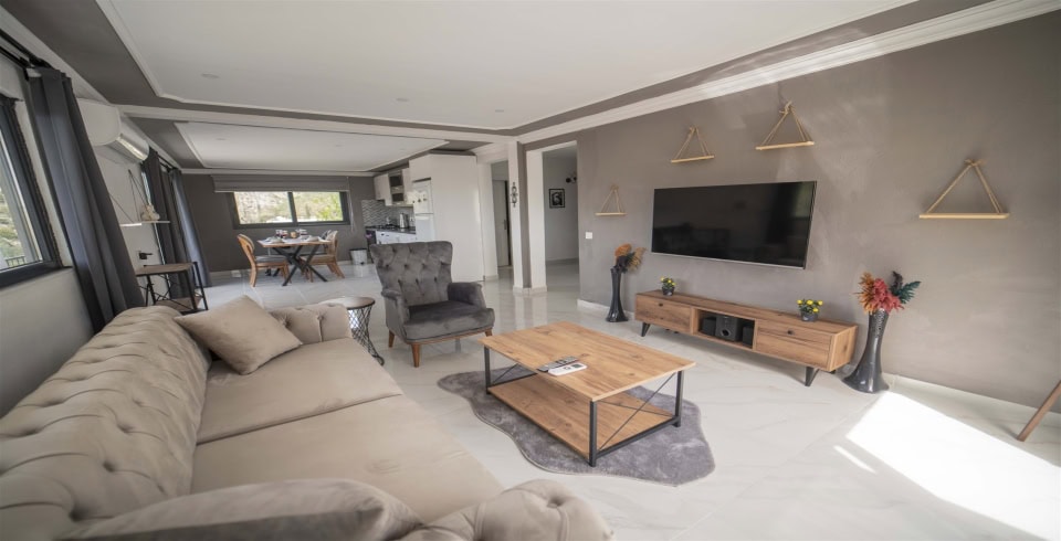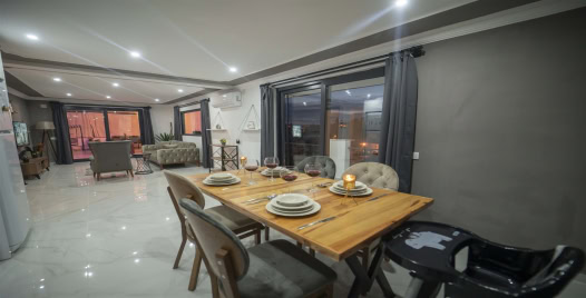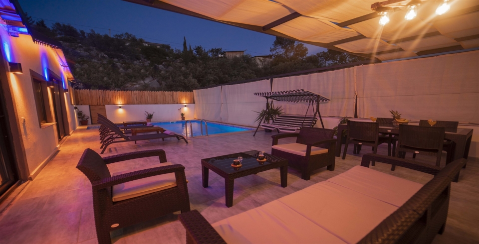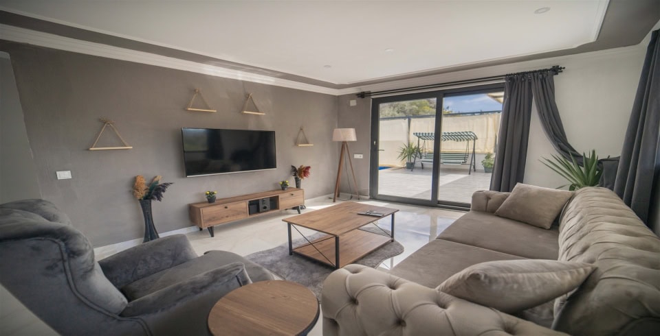 Salon : Villamızın iç dizaynı da son modaya uygun olarak modern bir şekilde tasarlanmıştır. Çeşitli dekoratif eşyalarla süslediğimiz salonumuz havuzlu bahçeye açılıyor. Villa salonunda oturma grubu, TV, internet, klima, yemek masası, sehpa bulunmaktadır.