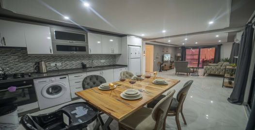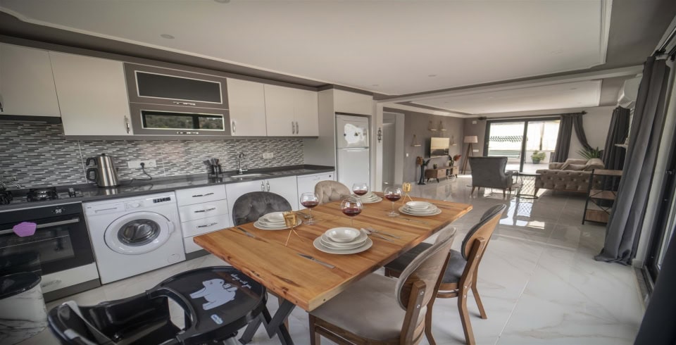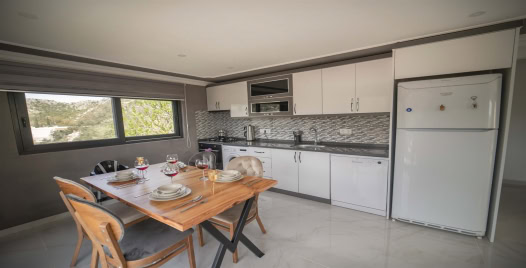 Mutfak : Modern Amerika mutfağımızda 4 kişilik yemek masası, buzdolabı, çamaşır makinesi, 4’lü ocak, elektrikli su ısıtıcısı, çatal-bıçak takımı, tencere-tava takımı, bulaşık makinesi bulunmaktadır.